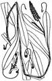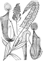 A typical line drawing from Danser's monograph, showing three herbarium specimens of the natural hybrid Nepenthes × hookeriana. The plant material illustrated includes a lower pitcher, an upper pitcher, a female inflorescence, an infructescence, and a portion of the stem. This figure was produced by Amir Hamzah, a draughtsman of the Buitenzorg Herbarium, under the direction of B. H. Danser.[1]