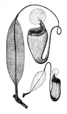 Danser recognised 65 species in total, of which 52 were given detailed treatments.[note a] This number included 17 newly described taxa: N. carunculata (later synonymised with N. bongso),[3][4] N. clipeata, N. dubia, N. ephippiata, N. fusca, N. inermis, N. insignis, N. leptochila (later synonymised with N. hirsuta),[4][5] N. mollis, N. paniculata, N. papuana, N. pectinata (later synonymised with N. gymnamphora),[3][4] N. petiolata, N. pilosa, N. spectabilis, N. tobaica, and N. tomoriana. All were described in great detail, with many accompanied by line drawings. Danser synonymised N. edwardsiana with N. villosa, N. hemsleyana with N. rafflesiana, and N. ramispina with N. gracillima;[1][6] all three were later reinstated as valid species.[4][7]