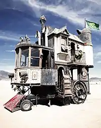 The Haul is often associated with steampunk, a sub-cultural movement that draws its inspiration from a fusion of Victorian-era science fiction and contemporary technology. True to the alternative histories that are a staple of the steampunk genre, the Neverwas Haul has its origin story in a history that never was, a history in which the Hibernian Empire (not the British Empire) dominated the sociopolitical landscape of the nineteenth century—Hibernia being an obscure name for Ireland. In this mythology, the Neverwas Haul is the greatest of all the Hauls – Romani vardo-like vehicles driven by "Track Banshees" – itinerant women who use their preternatural mechanical skills to keep their families on the move. The Haul is the primary mode of transport for the ″Traveling Academy of Unnatural Science,″ who seek to acculturate the heathens of the Black Rock Desert (where the Burning Man festival is held) by sharing such cultural staples as Gin and Tonics, and High Tea.[5]