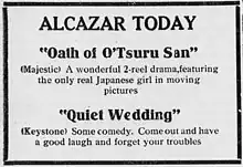 The Oath of Tsuru San is an American silent short drama film starring William Garwood and Japanese actress Tsuru Aoki. It was released in October 1913.[1]
