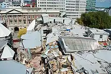 The Press Building showing damage from the February 2011 Christchurch earthquake, with the top floor of the building collapsed