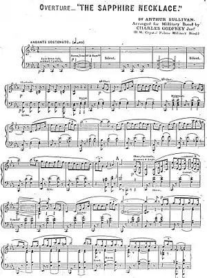 The Sapphire Necklace was intended to be produced by the Pyne & Harrison Opera Company,[4] which specialised in such romantic English operas.[6] However, the 1864–65 Pyne and Harrison season at Covent Garden proved to be the company's last, and so they never produced the opera.[7] Sullivan found no one willing to produce The Sapphire Necklace, though the overture and selections from it were performed at The Crystal Palace and elsewhere.[8]