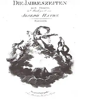 ![]() Title page of the first edition. Translated it reads, "The Seasons / after Thomson, / set to music by / Joseph Haydn. / Score. // Original edition. / [published by] Breitkopf & Härtel, Leipzig | |