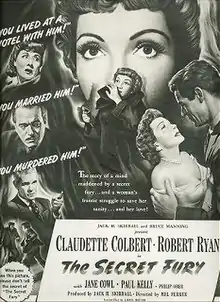 The Secret Fury is a 1950 American noirish psychological thriller starring Claudette Colbert and Robert Ryan. Directed by Mel Ferrer for RKO Radio Pictures, it also featured a rare screen appearance of Broadway legend Jane Cowl, [2] with Paul Kelly also in support.