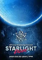 JO1 1st Live Streaming Concert "Starlight" is a virtual pay-per-view concert held on December 19, 2020, via Pia Live Stream.[6][41] Lasting for two hours and twenty minutes, the concert also consisted of talk and game segments.[42] The concert amassed an estimate of 120,000 viewers from 30 countries and regions besides Japan, such as the United States, Australia, China, South Korea, and Indonesia.[43][44] The concert was broadcast on TBS' cable television channel TBS Channel 1 on January 31, 2021, with exclusive behind-the-scenes footage and interview with the members.[45]