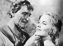 ![]() 1953 frame of the unfinished film. Shows Flynn as "William Tell"; Waltraut Haas as "Mary" | |