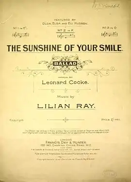 "The Sunshine of Your Smile" is a British popular song published in London in 1913 just before the First World War by Francis, Day and Hunter. The lyrics were by Leonard Cooke and the music by Lilian Ray.[1] It became a top ten hit in the UK Singles Chart in 1980, sung by Mike Berry.