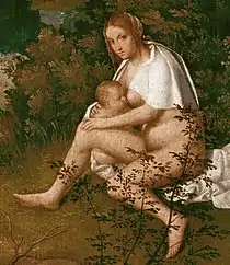On the right a woman sits, suckling a baby. The woman has been described as a gypsy since at least 1530,[1] and in Italy, the painting is also known as La Zingara e il Soldato ("The Gypsy Woman and the Soldier"),[2] or as La Zingarella e il Soldato ("The Gypsy Girl and the Soldier").[3] Her pose is unusual – normally the baby would be held on the mother's lap; but in this case the baby is positioned at the side of the mother, so as to expose her pubic area. A man, possibly a soldier, holding a long staff or pike, stands in contrapposto on the left. He smiles and glances to the left but does not appear to be looking at the woman. Art historians have identified the man alternatively as a soldier, a shepherd, a gypsy, or a member of a club of unmarried men. X-rays of the painting have revealed that in the place of the man, Giorgione originally painted another female nude.[4] One may also note the stork on the rooftop on the right. Storks sometimes represent the love of parents for their children.