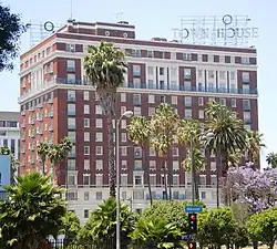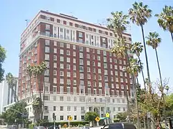 The Town House was developed by oil magnate Edward Doheny[3] as one of the most luxurious apartment-hotels in Southern California. Designed by Norman W. Alpaugh, and built at a cost of $3 million,[4] it opened on September 11, 1929.[5] It is a very late example of the Beaux Arts style, with a brick and terra cotta facade with classical detailing.[3] The building was converted to operate exclusively as a hotel in 1937, featuring one of the most glamorous bars in the city, the Zebra Room, with interiors by noted designer Wayne McAllister.