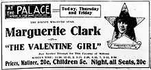 The Valentine Girl is a 1917 American silent romantic drama film directed by J. Searle Dawley and distributed by Paramount Pictures. The film starred Marguerite Clark, Frank Losee, and Richard Barthelmess.[1] Actress Laura Sawyer wrote the screen story.[2][3] The film is now presumed lost.[4]