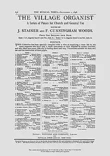 The Musical Times of 1 March 1897 advertised the first six volumes of a new series of organ music, also called The Village Organist and also published by Novello. The editors were John Stainer and F. Cunnigham Woods, who noted that they "have eneavoured to bring together a collection of pieces ... simple, without being uninteresting and effective where the instrumental resources are limited".[7] Each volume was priced at one shilling.