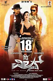 Director Prem announced new film starring Shivaraj Rajkumar and Kichcha Sudeepa. The film is about a villager who dreams to become an actor. The film is produced by C. R. Manohar and they signed Bollywood actor Mithun Chakraborty in an important role that has been kept as a secret in the beginning, but the news was later leaked to the press.[3] The film was launched by then Karnataka's Chief Minister Siddaramaiah on 13 December 2015[4][5] and the first look was released in March 2017.[6] Before the release of the first look, the movie was titled as Kali taglined Ruler Warrior. But later was changed as The Villain taglined Ram Ravan due to some reasons. The film completed a schedule and was reported to have portions in England and two other foreign countries to be shot. By then, the film fetched 5.4 crore as Hindi rights. Actress Amy Jackson was signed as the female lead.[7][8] The song "Jeeva Hoovagide"[9] from Nee Nanna Gellalare composed by Ilaiyaraaja was shot with Shiva Rajkumar and Amy Jackson in replicated costumes of Rajkumar and Manjula from the original film in a schedule where entire talkie portions were shot, except few songs.[10][11] Later, filming the climax was completed on 1 February as per actor Sudeepa's tweet.[12]