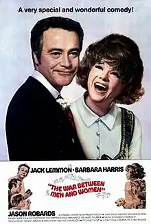 The War Between Men and Women is a 1972 American comedy-drama film directed by Melville Shavelson and starring Jack Lemmon, Barbara Harris, and Jason Robards. The film is based on the writings of humorist James Thurber, and was released by Cinema Center Films. It features animated cartoons interspersed in the story based on Thurber's works. Shavelson was creator of the 1969 Thurber-based television series My World and Welcome to It. The screenplay is by Shavelson and by Danny Arnold, who also worked on the 1969 series. Lisa Gerritsen, who plays Linda Kozlenko in the film, previously co-starred in My World and Welcome to It as Lydia Monroe.