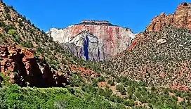 The West Temple is a prominent 7,810-foot (2,380 m) mountain summit composed of Navajo Sandstone in Zion National Park in Washington County of Utah, United States. This, the highest feature in Zion Canyon, was originally called "Temp-o-i-tin-car-ur" meaning "Mountain without a trail" by the Paiute people.[4] It was called Steamboat Mountain by local Mormon settlers before 1934, when the USGS officially changed it to its present name, which was applied by John Wesley Powell during his explorations in 1872.[5] West Temple is situated two miles northwest of Springdale, Utah, one mile northeast of Mount Kinesava, and two miles west of the park headquarters. It is one of the notable landmarks in the park. The nearest higher peak is Windy Peak, 10.46 miles (16.83 km) to the north.[1] Precipitation runoff from the mountain drains into tributaries of the Virgin River.