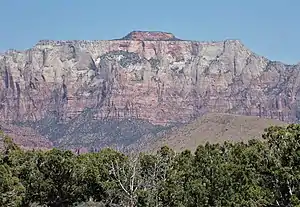 The upper white cliffs are composed of Navajo Sandstone, which in some places exhibit reddish staining caused by hematite (iron oxide), the source of which is the Temple Cap Formation caprock at the summit.[7] Lower slopes and ledges are composed of Kayenta Formation, Moenave Formation, Chinle Formation, and Moenkopi Formation.