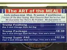 The establishment has a history of political satire in its signage and advertising. In March 2016, the restaurant offered 3-inch "Trump footlong" hot dogs.[12] In June 2017, they advertised "Paris Accord compliant covfefe".[13] In March 2020, signage mocked the commuting of the sentence of Rod Blagojevich.[14] In 2021, the establishment announced that it intends to serve alcohol when it reopens.[15]