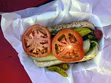 The establishment is known for its char-grilled food, especially its hot dogs and hamburgers (commonly called char-dogs and char-burgers).[5] A Wiener Circle char dog with "the works" is a grilled Vienna Beef hot dog on a warm poppy seed bun, topped with mustard, onions, relish, dill pickle spears, tomato slices, sport peppers and a dash of celery salt.