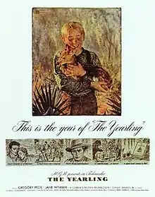 The Yearling is a 1946 American Family Western film directed by Clarence Brown, produced by Sidney Franklin, and released by Metro-Goldwyn-Mayer (MGM). The screenplay by Paul Osborn and John Lee Mahin (uncredited) was adapted from Marjorie Kinnan Rawlings's 1938 novel of the same name. The film stars Gregory Peck, Jane Wyman, Claude Jarman Jr., Chill Wills, and Forrest Tucker.