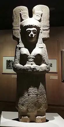 The sculpture is estimated to have been created between 1450 and 1521, during the postclassic period. It is a 2-meter (6 ft 7 in) tall, 60-centimeter (24 in) wide, and 25-centimeter (9.8 in) thick limestone artwork that depicts a woman wearing a blouse and ankle-length skirt.[3][4] She appears to wear jewelry, including circular pendants known as "oyohualli".[3] Her eyes are hollow indicating that they probably had stones in them.[4] At her bare feet,[4] there is a stake that allowed the sculpture to be placed in the ground upright.[3]