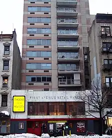 The renovation of Theater for the New City came at a great cost to its relationship with the community in 2000 when Mayor Rudolph Giuliani sold the air rights above the theater (which the city had retained) to a developer. TNC was at that time in default of a loan borrowed against a pledged grant from the Manhattan Borough President's Office, which never materialized. The City put a lien against TNC in 1997 and unable to find a major donor to pay off the $519,634 lien, TNC was forced to agree to the construction of a 12-story tower above their space in order to have the lien forgiven.[16] The Faustian deal was somewhat sweetened by giving TNC an extension on their mortgage and allowing the theater to have one seat on the condo board. Being vastly taller than the 6-story tenement buildings prevalent in the Lower East Side, the condo tower was seen as a threat to the character of the neighborhood and construction in 2000 occurred amidst great protest.[17] The tower became even more of a controversy when the developer hired non-union workers to build the tower.[18]