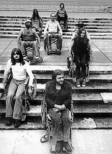 Wyatt and most of the band members appeared in a promo photo, which was used for the concert poster and on the cover of NME.[22] In the photo, the band members sat in wheelchairs for the photo in a display of "wheelchair solidarity" with Wyatt.[22] Mason was superimposed into the image later.[23] Commenting on the photo years later, Wyatt told Uncut it was "a real laugh doing it", but said that the NME received complaints from readers who felt the image was "a bit tasteless".[23] Wyatt said he couldn't understand those who objected to the image: "I thought it was a very good idea. Especially on steps—wheelchairs on steps are dangerous, they're rubbish! There are people in wheelchairs and with other disabilities, who I know from letters and so on, who were very encouraged that far from my career as a musician being over, it actually got much stronger in terms of my contribution to it."[23] The concert announcement in the NME prominently mentioned that the show would feature Oldfield, who was already one of the best-selling British musicians of the 1970s with the multi-platinum Tubular Bells and its followup Hergest Ridge released the month before the concert.[18]