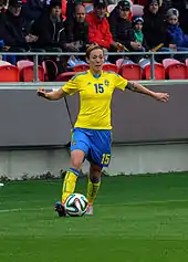 Coach Sundhage continued to select Sjögran for Sweden's successful 2015 FIFA Women's World Cup qualification campaign.[84] She played alongside Lotta Schelin as a forward against Northern Ireland in Växjö, deputising for the injured Kosovare Asllani,[85][86][87] a move that surprised some, as older players tend to get moved backward a bit and have a more defensive role.[88][89][90] She scored the first goal.[87] That was her 193rd game in the national team.[89][91] In October 2014 Sjögran reached her 200th appearance for Sweden, in a 21 home friendly defeat by Germany. She became the first Swedish player to achieve the milestone and only the third European after Birgit Prinz and Katrine Pedersen.[92]