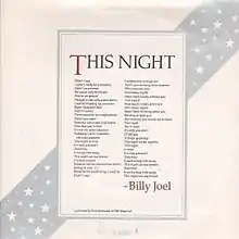 "This Night" is a song by Billy Joel released as the sixth single from his album An Innocent Man. The basis of the song's chorus uses the second movement of Ludwig van Beethoven's Pathétique Sonata.[1] Beethoven is credited as one of the song's writers on the sleeve of the album as "L.v. Beethoven". Joel has said in interviews that "This Night" was written about his brief relationship with supermodel Elle Macpherson, whom he dated just prior to second wife Christie Brinkley.