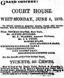 - ↑ "Famous Musician Dead" (obituary of Thomas Coates). Philadelphia, Pennsylvania: The Times, October 13, 1895 (subscription required).