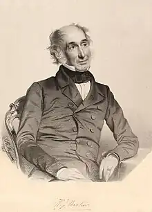 The series of 60 scientific portraits by Maguire[2] was privately commissioned by George Ransome, FLS, of Ipswich, in connection with the foundation of the Ipswich Museum. They were executed cumulatively between 1847 and 1852, as the Museum obtained fresh scientific sponsors. Some were made by the artist from life, and others from photographic portraits or (in the case of the Revd William Kirby) from an oil portrait. The exact total of this series is slightly above 60 because some (e.g. Edwin Lankester) were re-drawn. Copies of the lithographs were given to subscribing members of the Museum, and a bound portfolio copy of the series was presented by Professor J.S. Henslow to Prince Albert when he inspected the Museum on the occasion of the 1851 Ipswich Congress of the British Association for the Advancement of Science. George Ransome resigned his position as founding Secretary of the Museum in 1852 and the cumulative series was then discontinued.[3] His drawing of William John Burchell dated 1854 was engraved by M. & N. Hanhart.