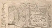 Johnston engraved the first known print of an historical event in the colonies,[26] an overview of the Battle of Lake George. The battle scene —A prospective plan of the battle fought near Lake George on the 8th of September 1755 – was originally drawn by Samuel Blodgett, a sutler who had witnessed the Battle.[27][28] Johnston engraved Blodgett's sketch onto a copper plate with Boston printer Richard Draper printing it,[27] with the print then being sold by Blodgett in December 1755.[29] Johnston's engraving of the battle is divided into different sections. On the left an above view of marching soldiers, on the right the view of the soldiers' camp and of the battle itself. The engraving also pictures the Hudson River, Fort William Henry and the New York town of Fort Edward.[30] A pamphlet consisting of five pages describing the Battle plus a single page of advertisements accompanied this engraving.[31] Johnston's print was reprinted in London by Thomas Jefferys, being published six weeks later in February 1756,[32] along with an explanatory eight-page pamphlet.[33]