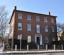 The three story brick house was built in 1809 for Thomas March Woodbridge, owner of a local tannery. Its construction has been attributed to noted Salem builder Samuel McIntire, based on its similarity to other McIntire works. It is square, with five bays on each side. The front door is centered on the main facade topped by a semi-elliptical fanlight and flanked by sidelight windows. Entrances on the side elevations are sheltered by broken pediments supported by Doric columns.[2]