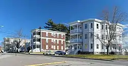The Thomas Nichols Three Deckers are located north of downtown Taunton, on the south side of West Britannia Street between Hopewell and Thomas Streets. They are located a short walk from the Reed and Barton Complex, historically one of the city's major industrial employers. All three are fairly typical triple deckers, of wood-frame construction with flat roofs. They were all originally sided with wooden shingles, have corner pilasters, and the roofs had extended eaves studded with modillion blocks. Of the three, only #80 retains all of these features: #68 has been refinished in wooden clapboards and synthetic siding, and the eaves no longer have modillions. #88 has been refinished in aluminum siding and has none of these features. All three have three-story porches on one side of the front, and a projecting polygonal bay on the other. Porches and projecting bays are also found on one side of numbers 80 and 88. The front porches have round columns for support, and have a broad entablature at the top of the third floor.[2]