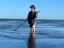 A typical crabber at Thompson Beach. Note the use of a specialised crab rake.