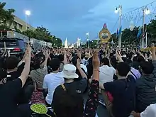 Protesters displaying the three-finger salute in front of the Democracy Monument during the 2020 Thai protests