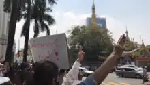 In response to the 2021 Myanmar coup d'état, a group of about 200 Burmese expatriates and some Thai pro-democracy activists including Parit Chiwarak and Panusaya Sithijirawattanakul protested the coup at the Burmese embassy on Sathon Nuea Road in Bangkok, Thailand, with some protesters reportedly showing the three-finger salute.[6] The protest ended with a police crackdown; two protestors were injured and hospitalised, and two others were arrested.[7]