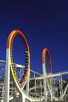 Built by Japanese firm Sanoyas Hishino Meisho, the Thunderbolt measured 1,207 metres (3,960 ft) in length making it the longest roller coaster in Australia.[3][7] Even after the ride's closure, it remained the longest Australian roller coaster until the opening of DC Rivals Hypercoaster at Movie World Gold Coast in September 2017.[8] It was capable of reaching speeds of up to 87 km/h (54 mph).[3] The ride, which stood 31 metres (102 ft) off the ground, featured two vertical loops standing at 21 metres (69 ft) each.[3]