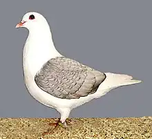 The Thuringian Colour pigeons are a group of breeds of fancy pigeons developed over many years of selective breeding.[1] Thuringian Colour pigeons, along with other varieties of domesticated pigeons, are all descendants from the rock pigeon (Columba livia). The breed group is known for several different colours and markings. Varieties include the Thuringian Breast, Thuringian Monk, Thuringian Shield (picture), Thuringian Whitetail and the Thuringian Spot. The breed can be either plain or shell crested, but is always clean-legged.[2]