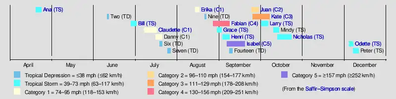 Tropical Storm Odette (2003)Tropical Storm Nicholas (2003)Tropical Storm Larry (2003)Hurricane Kate (2003)Hurricane JuanHurricane IsabelTropical Storm Henri (2003)Tropical Storm Grace (2003)Hurricane FabianHurricane Erika (2003)Hurricane Claudette (2003)Tropical Storm Ana (2003)Saffir–Simpson scale