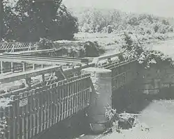 Tinkers Creek Aqueduct is an aqueduct that was constructed to bridge the Ohio and Erie Canal over Tinkers Creek near its confluence with the Cuyahoga River in Valley View, Ohio. It is a relatively rare surviving example of an Ohio and Erie Canal aqueduct. It was originally constructed in 1825-1827 by, and re-built due to flood damage in 1845 and 1905.[11] Tinkers Creek Aqueduct was included in a National Historic Landmark district established in 1966, and it was separately listed on the National Register of Historic Places in 1979.[12][13] The original Tinkers Creek Aqueduct was a wood plank, steel truss, and Ashlar-sandstone structure constructed in 1827, south of the present aqueduct's location. Cuyahoga River and Tinkers Creek flooding caused continual damage to the original aqueduct, so successive structures were built in 1845 and 1905 in the present location. Today, Tinkers Creek Aqueduct is the only aqueduct which remains of the four original aqueducts in the Cuyahoga Valley.[6] Of Furnace Run Aqueduct, Mill Creek Aqueduct, Peninsula Aqueduct, and (? Yellow Creek ?) Aqueduct; Mill Creek Aqueduct, of newer construction, is the only aqueduct which still carries Ohio and Erie Canal water. After 102 years of flooding, weathering, and deterioration, Tinkers Creek Aqueduct was removed in 2007. The National Park Service is currently working on Phase II of the project to reconstruct it from newer materials.[10]