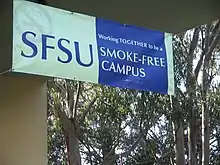 There are two primary devices utilized to reduce tobacco use on college campuses. One is to remove the option to smoke, and the other is to educate, inform and introduce cessation programs influencing users to quit. A 2005 study found that restriction of tobacco distribution and restriction of smoking within 20 feet of entrances were not as effective as smoking cessation programs in decreasing college students' smoking.[18] When prevention-oriented education was present on college campuses, students were 23% less likely to smoke compared to their peers who were not exposed to this kind of education.[18][19] This can be further substantiated by a more recent study which took place from September 2013 to May 2014. The study was conducted in which 1309 students at eight California Universities were surveyed periodically to assimilate the correlation of stricter tobacco policies compared to exposure of college students to secondhand cigarette smoke. The surveys statistics indicated as policy strictness increased, exposure to secondhand smoke decreased. After 30 days, student surveys showed smoking exposure drop from 81% to 38% as anti-tobacco policies strengthened. Percentages for entirely tobacco-free campuses ran as low as 3% after 6 months.[20]