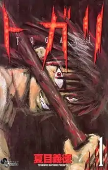 Togari is written and illustrated by Yoshinori Natsume. The manga was serialized in Shogakukan's Weekly Shōnen Sunday from August 16, 2000, to February 27, 2002,[5][6] ending the series prematurely at 68 chapters. ending the series prematurely at 68 chapters. Shogakukan collected its chapters in eight tankōbon volumes, released from January 18, 2001, and March 18, 2002.[7][8] The abrupt ending was intentional by the publishers, as the last four pages of the 8th volume has a spoof advertisement for "Togari: The Perfect Edition". Then the publishers apologized for the spoof in the last page of the volume.[9] Media Factory republished the series in a four-volume edition,[10] released from October 23 to November 22, 2010.[11][12]
