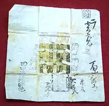 Regarding copper coins, the Kan'ei Tsūhō coin (Kyūjitai: 寛永通寶 ; Shinjitai: 寛永通宝) came to replace the Chinese coins that had been in circulation in Japan, as well as those that were minted privately, and became the legal tender.[6] This put an end to more than four centuries during which Chinese copper coins, obtained through trade or Wakō piracy, had been the main currency of Japan.[6]
