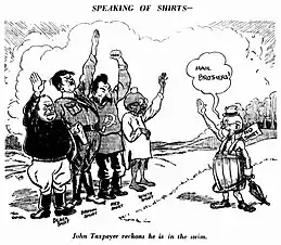 Through the pages of The Sun Glover's caricatures and commentary on politics, society and topical news-stories became an institution. His portrayal of 'John Citizen' or 'John Taxpayer' was a character representing the average man.[27] The figure, moustachioed and wearing a hat, made frequent appearances in Glover's cartoons.[31]