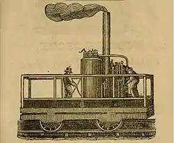 Tom Thumb was designed by Peter Cooper as a four-wheel locomotive with a vertical boiler and vertically mounted cylinders that drove the wheels on one of the axles. The "design" was characterized by a host of improvisations. The boiler tubes were made from rifle barrels[2]:11 and a blower was mounted in the stack, driven by a belt to the powered axle.[2]:12[4] The engine was fueled by anthracite coal.[5]