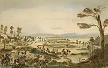 In January 1861, Tom, Horatio and a party of employees and their families travelled by ship to Brisbane, disembarked in Moreton Bay, and then, with livestock and supplies, set out on an eight-month trek through Queensland's rugged interior.[117] Food was scarce and Tom hunted native game to fend off starvation.[119] They suffered many other hardships and even death when, in Toowoomba, one of Horatio's men drowned.[119] On the Darling Downs over 10,000 sheep were collected.[120] Hitherto the largest group of colonists to enter the area, the Wills party drew the attention of local Aboriginal people.[121] Wary of what he called the "perpetual war between the whites and blacks" of Central Queensland, Horatio sought to avoid conflict.[122] The party reached Cullin-la-ringo, situated on Gayiri Aboriginal land, in early October, and proceeded to set up camp.[123]