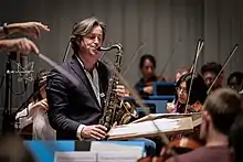 The next seven years were spent preparing for a much bigger orchestral work, the saxophone concerto Hiroshima (1998). This was premiered with the Orchestra of St. John Smith's Square at Chelmsford Cathedral and included strings, brass, woodwinds, percussion, piano, and saxophone. Smith appeared as solo saxophonist for Sally Beamish's The Knotgrass Elegy, commissioned for the 2001 BBC Proms, and performed with the BBC Symphony Orchestra at the Royal Albert Hall in London.[7] In 2002, Smith performed his earlier and much lengthier re-invention of Children's Songs for saxophone and orchestra with the Scottish Ensemble at St John's Kirk, Perth.[8] Other classical music endeavours have included a massive undertaking for the Edinburgh Youth Orchestra's 40th anniversary in 2003. A suite, entitled Edinburgh, was written for the occasion with saxophone, bass, drums, and a one hundred person symphony orchestra. The work toured Scotland, Estonia, Russia, and Finland