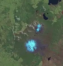 There are a number of Māori religious sites within the park,[3] and many of the park's summits, including Ngauruhoe and Ruapehu, are tapu, or sacred.[4] The park includes many towns around its boundary including Ohakune, Waiouru, Horopito, Pokaka, Erua, National Park Village, Whakapapa skifield and Tūrangi.