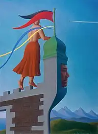 Tony Phillips (born 1937) is an American artist and educator based in Chicago whose work has included painting, drawing and film.[1][2][3] He is associated with figurative and surrealist currents of Chicago art in the later 20th century, without precisely being identified with such groups as the Imagists or The Hairy Who; critics have suggested that the lack of such affiliations has caused him and similar artists in the city to be comparatively overlooked.[4][5][6] His art employs painterly, softly modeled representation that belies sometimes dark psychological explorations and fantastical or archetypal scenarios.[7][8][9] Art in America critic Robert Berlind wrote, "Phillips's best pictures, with their particular tension between humor and eeriness, between the familiar and the eccentric, between the fanciful and the obsessive, are like a high-wire act, carried off in dream time."[1]