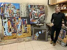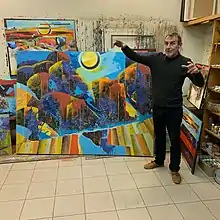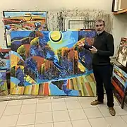 Tony Zhuravel's painting style incorporates a layering effect. His method interleaves textures, blending color and a subjective atmosphere within her imagery. He paints using unpredictable palettes, a spectrum of color. Indeed, his surprising use of color has become a distinctive attribute of his work. Tony's abstract western landscapes experiment with this concept of the horizon; austere western prairie bonded with a shifting sky. So much more than just a thin line, his imagery reveals the horizon's intricate variety in rich layers and unusual colors. All the consequences of an unaffected invention that results from intuitive strokes on the canvas.[2]