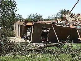 When a severe thunderstorm that formed in Phillips County moved eastward into Smith County, it produced Kansas' first tornado of the day. The short-lived tornado's maximum damage was assessed as F0. Shortly after the end of the tornado's two-minute life, its parent thunderstorm left Kansas and entered Nebraska.[4] Later in the day, an F2 tornado that was the costliest tornado of the day struck the town of Sabetha in Nemaha County. The tornado, which touched down half a mile west of the Sabetha City Hall, caused serious damage to two blocks of the town, with 18 buildings in the downtown area being damaged, five (including the city hall building) to near "the point of loss". The tornado lifted about half a mile east of City Hall. Damage to the city hall building amounted to $2 million, and additional damage to homes and vehicles away from downtown occurred due to tornado-toppled trees and branches away from the tornado's center along with strong straight-line winds.[5]